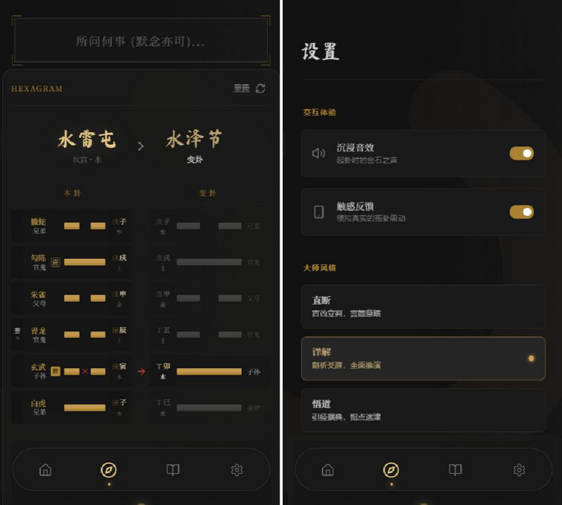 功能完整:支持手动指定卦式、时间自动排盘,涵盖感情/事业/财运等占问事项,展示本卦、变卦、六亲、伏神等信息;