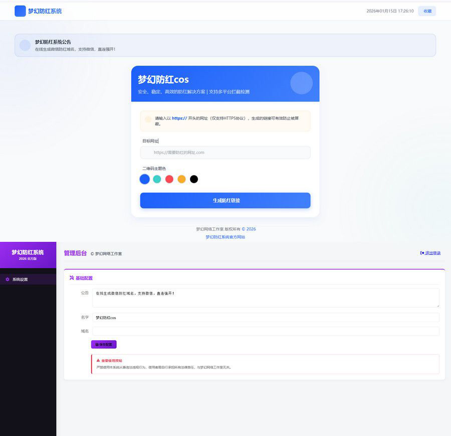 2026年防红cos系统带后台4.5版 生成链接全套防红,之前需要添加接口,现在只需要绑定域名,直接输入域名即可 只要域名微信可以打开的,没有红的,哪怕你之前红的域名 去生成的红域名链接,都是可以打开,不是单页防红,是全套防红 优化安装页面还有框架布局,php7.2以上即可 上传源码链接,你的域名/install.php,去安装即可 增加了生成域名自动带检测是否被拦截的状态