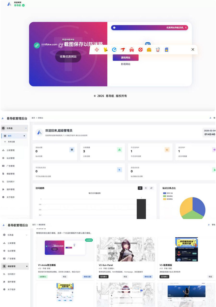 也想出现在这里?点击联系我~ 去授权版最新易导航系统源码,一款易导航集合市面大部分导航模板,并且直接给授权去掉了,简单的测试了这款导航系统,体验还是比较不错的,去掉了授权,后台可自定义前端模版,还是不错的导航系统,并且是开源支持二次开发 付费下载 当前内容需要登录后下载 VIP折扣 折扣详情 体验VIP会员0.00C币10折月卡VIP会员0.00C币8折年卡VIP会员0.00C币5折终身VIP会员0.00C币2折 登录购买 升级会员